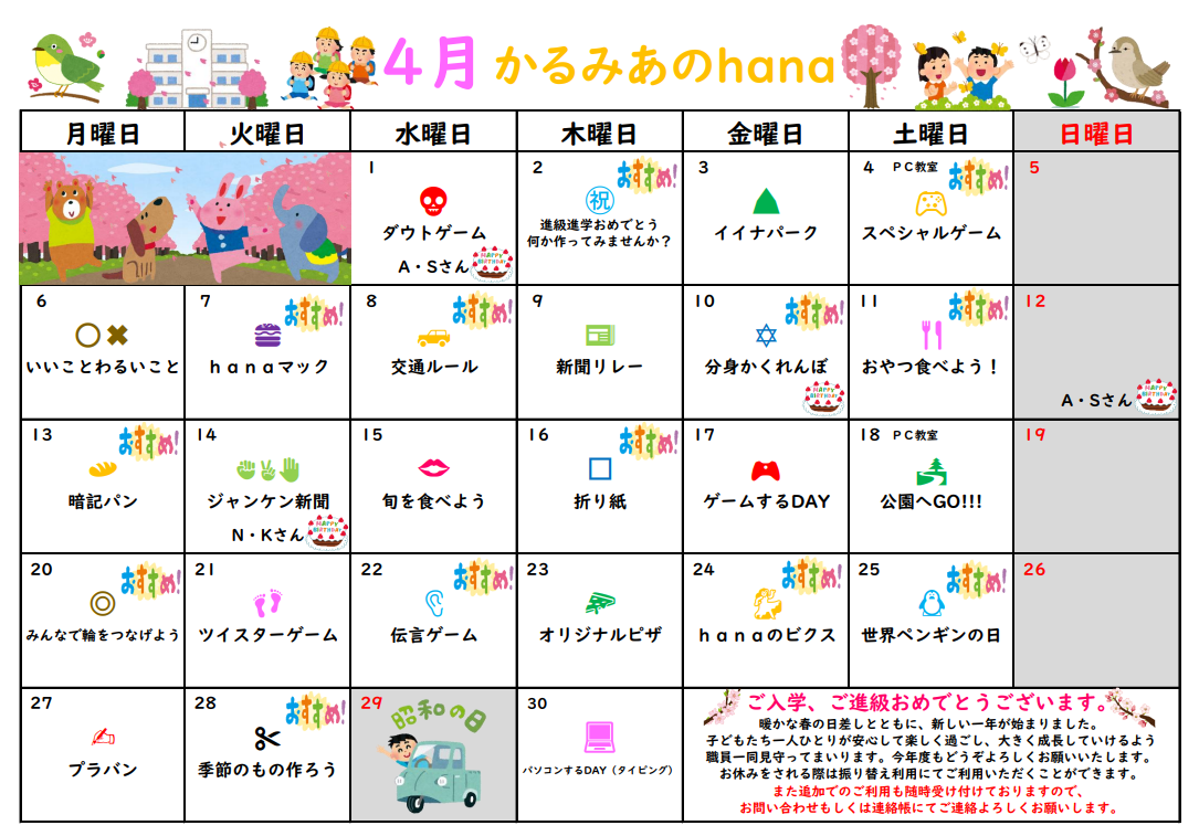 放課後等デイサービス チームかるみあ » カレンダー・かるみあ通信 » 2026年4月カレンダー