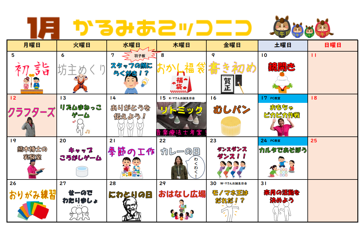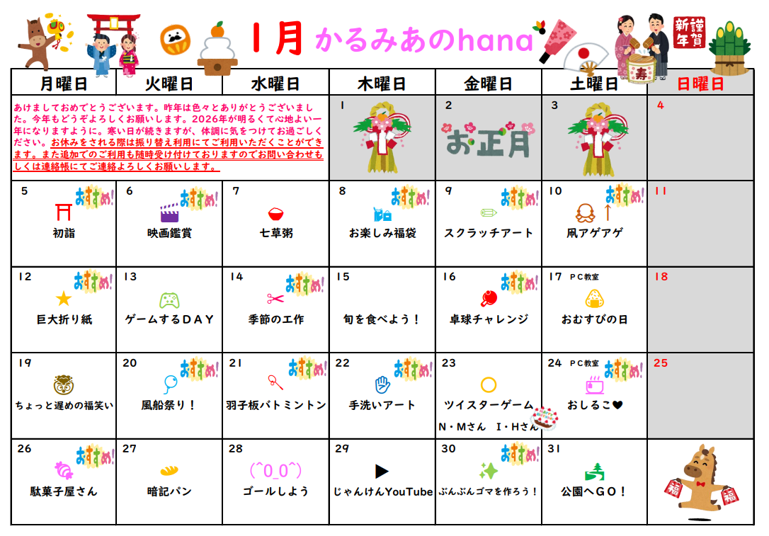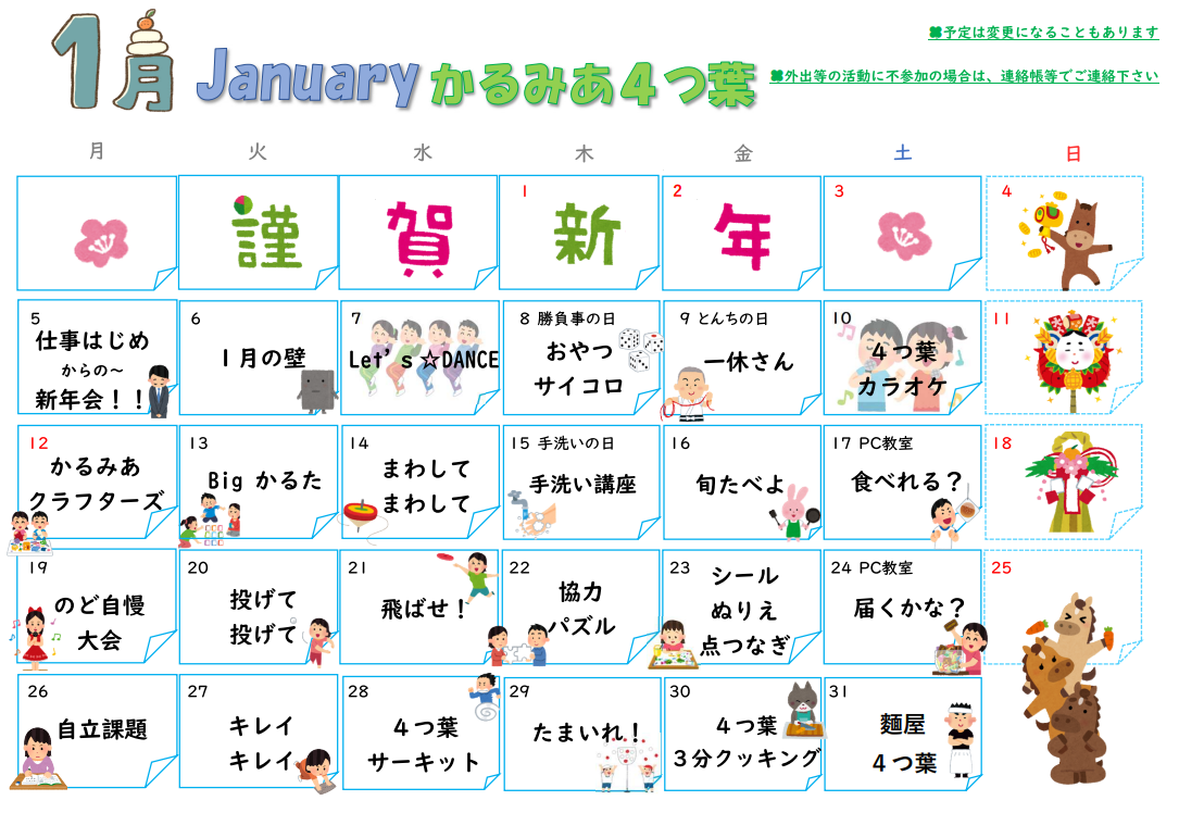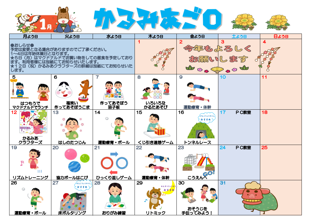放課後等デイサービス チームかるみあ » カレンダー・かるみあ通信 » 2026年1月カレンダー