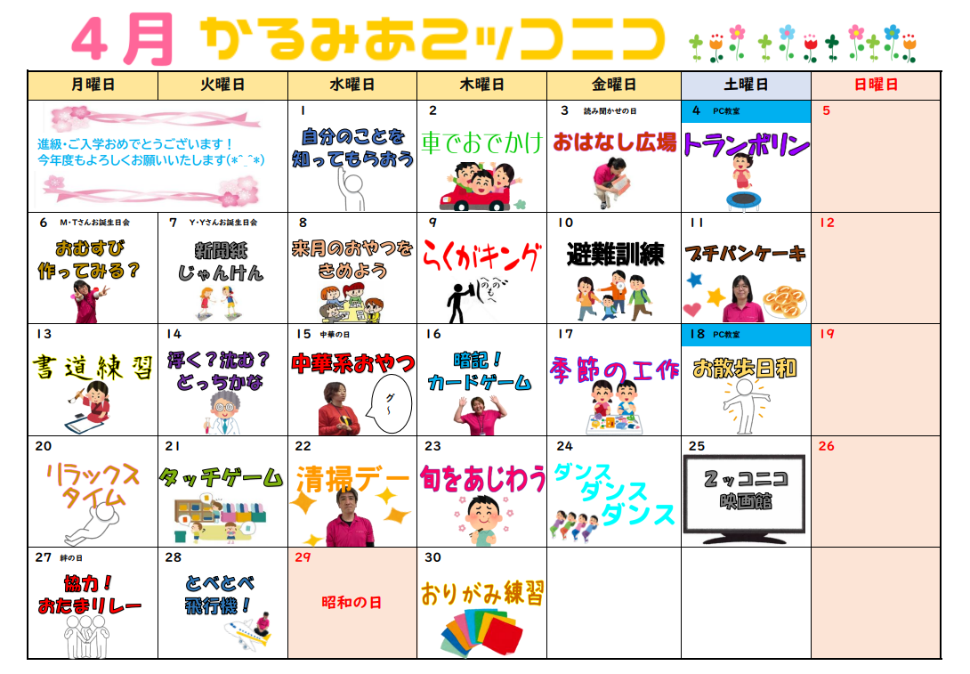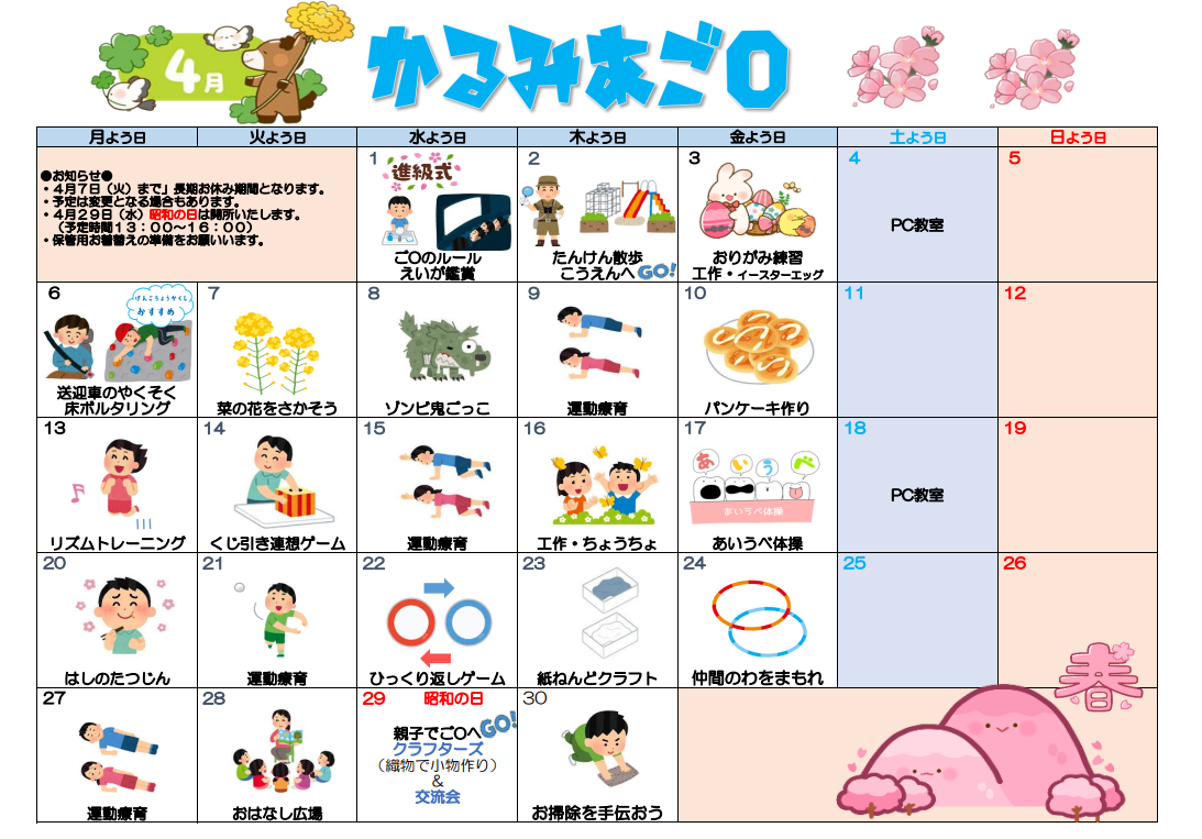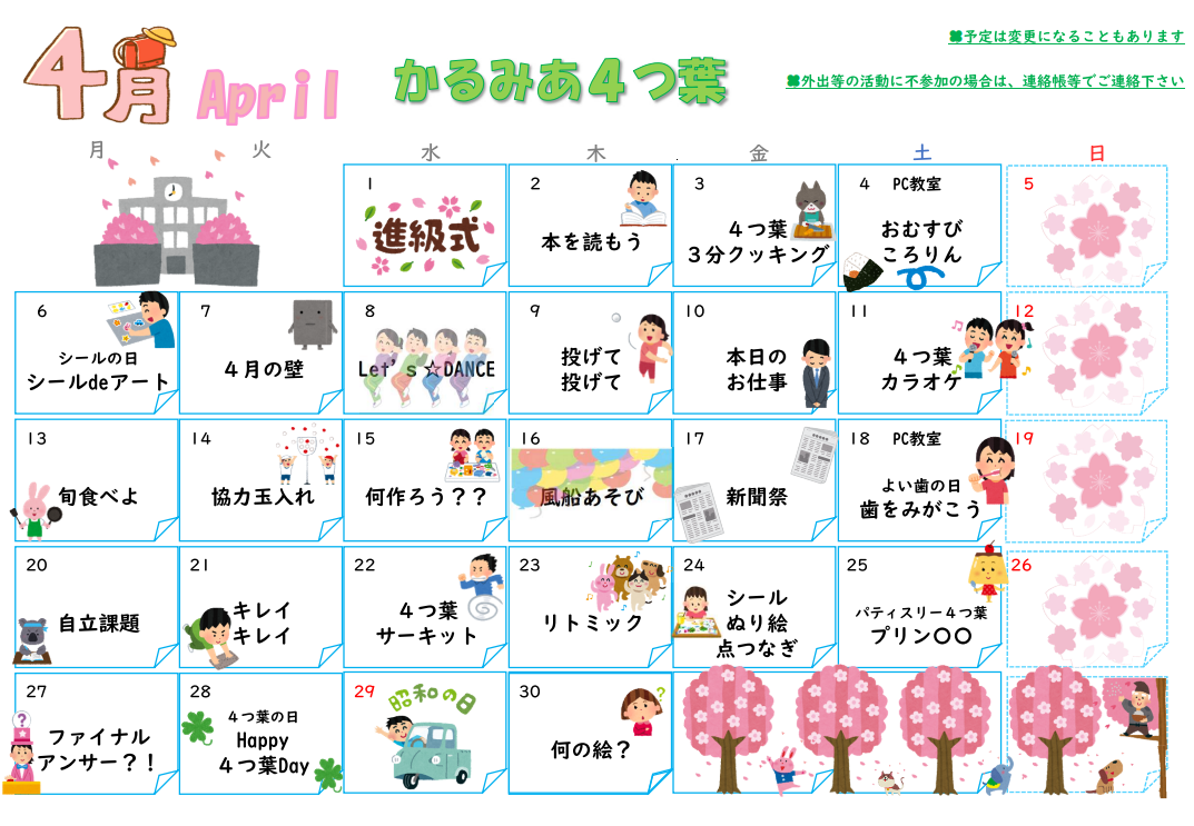 放課後等デイサービス チームかるみあ » カレンダー・かるみあ通信 » 2026年4月カレンダー