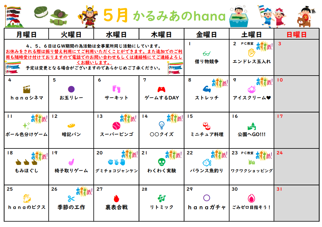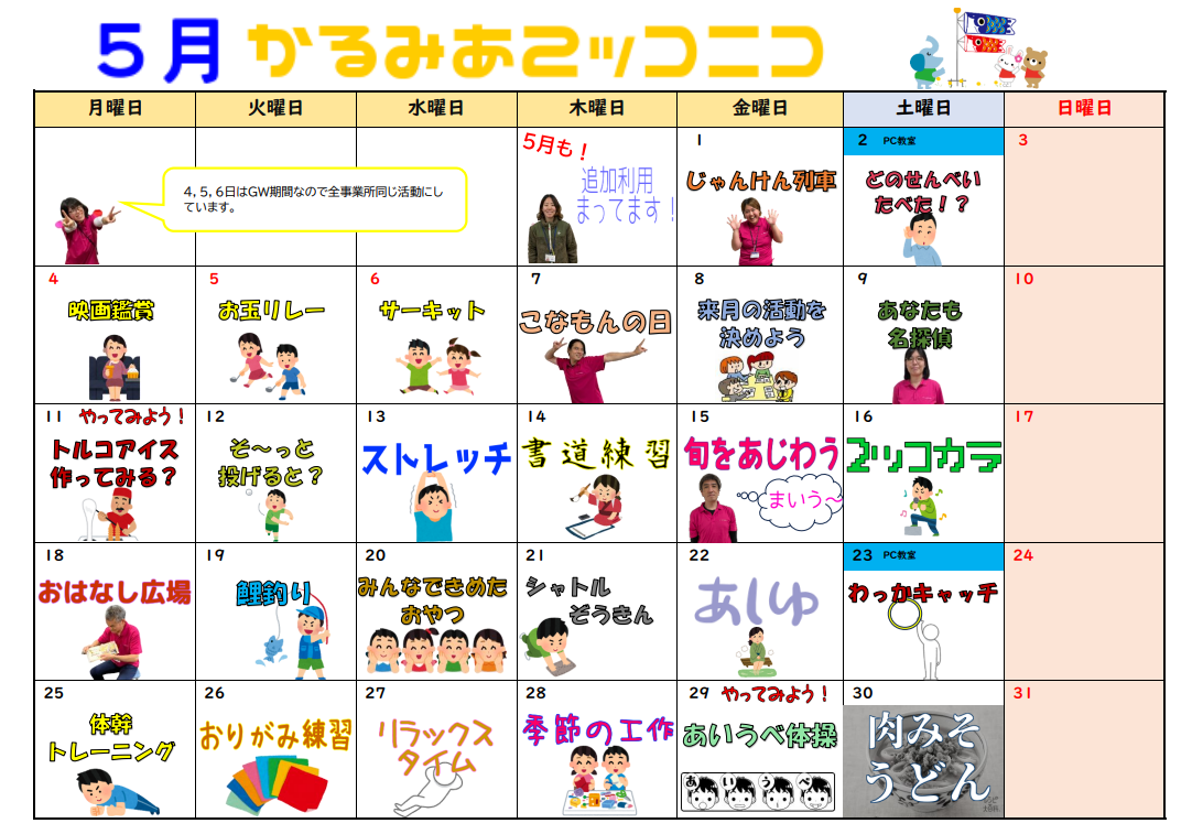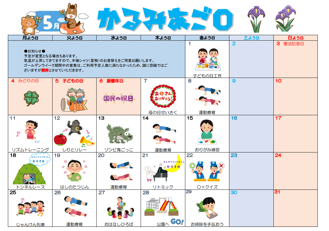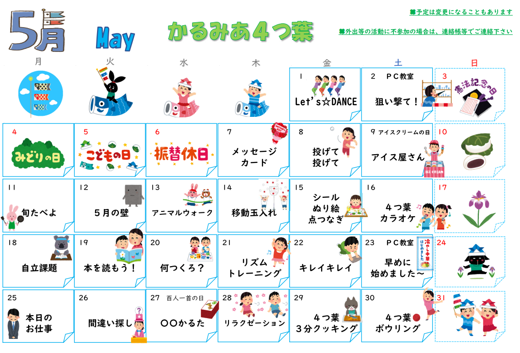 放課後等デイサービス チームかるみあ » カレンダー・かるみあ通信 » 2026年5月カレンダー